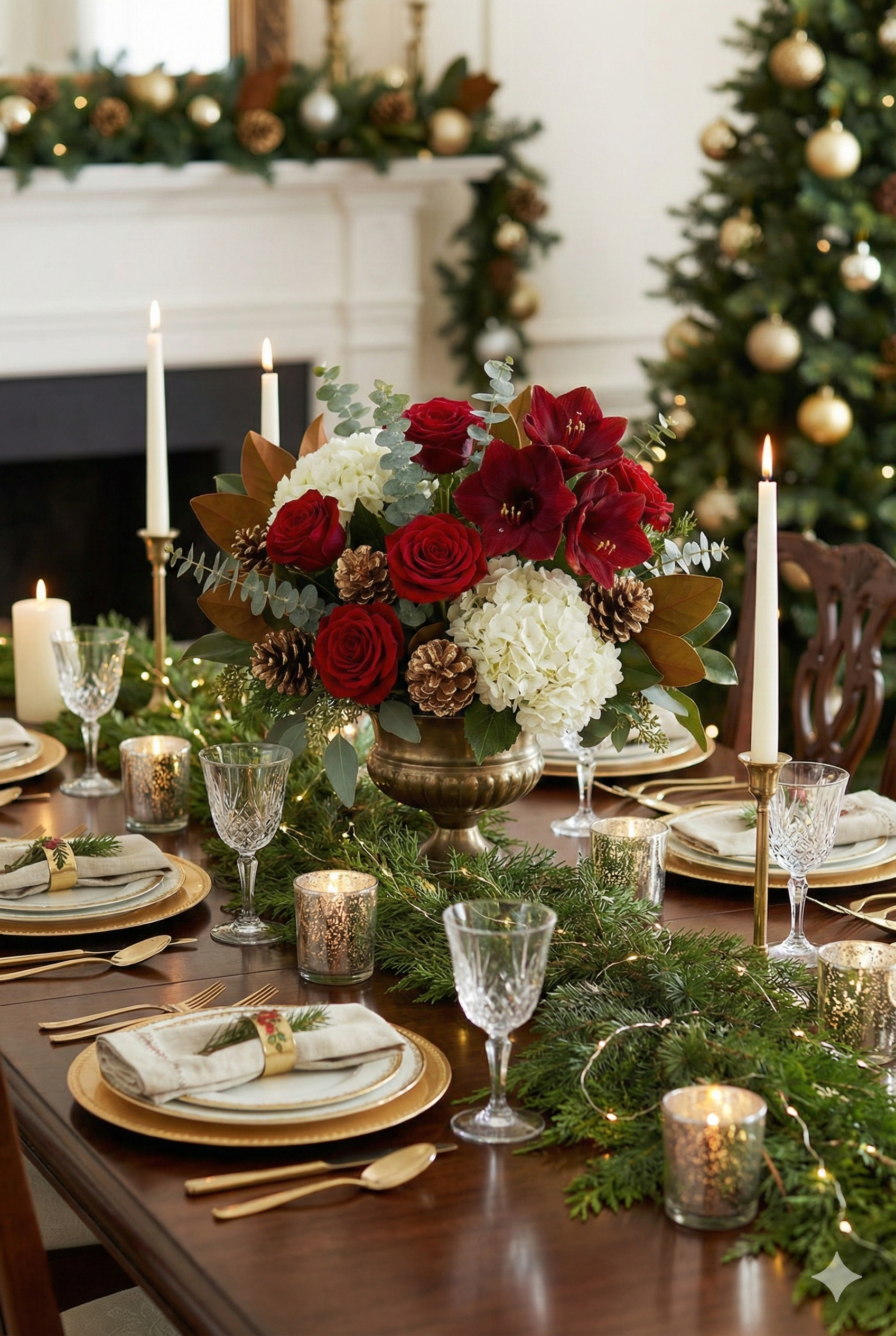 Create stunning focal points with arrangements of fresh flowers, evergreen branches, berries, and seasonal elements like amaryllis or white roses.